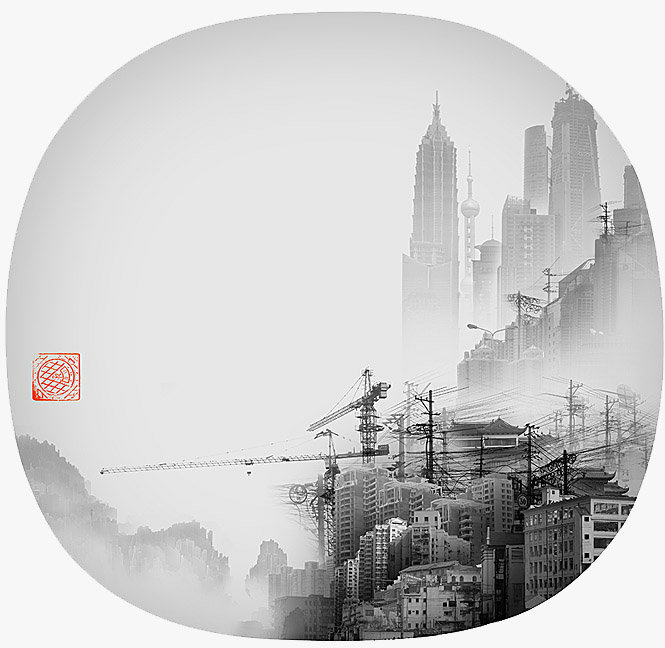 Yang Yongliang cleverly recreated "Cun", the main representation of Chinese Shanshui paintings by using a camera, the contemporary visual device, to express his creativity for the subjects he is concerned with. He combined the traditional Chinese paintings with the modern Shanghai city life and the details reveal current urban culture. The scenes of construction sites, large cranes, traffic signs and fly-overs those all Shanghai citizens are familiar with and all have become critical elements in his artworks. These common objects can be found everywhere in Shanghai, Yang Yongliang has arranged them to fit into the traditional Chinese Paintings' composition. When watching the photographic works at a distance, they are dreamlike Shanshui paintings. On the contrary when looking at them closely, they become shockingly modern city views. He perfectly handles the contradictions between ephemeral and solid, vigor and gentle, sparse and bold, beauty and ugly so as to make the entire picture poetically harmonious, but the details are 'blots on the landscape'. He successfully achieves a perfect balance between fragility and danger, beauty and cruelty. He brings the viewers not only visual enjoyment, but also the contemplation and self-examination of the various social and cultural concerns.